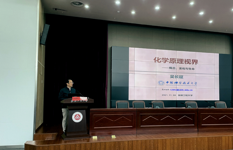 报告会第二阶段,吴长征教授作了题为“化学原理视界——概念、变化与人生” 的学术报告,报告从“科学、化学、变化、人生”四个方面展开,深入浅出地介绍了诸多热力学基础理论,谈古论今,从哲学、历史的角度阐述事物的特征与化学基本原理的关系,激励广大同学珍惜时间,积极进取。