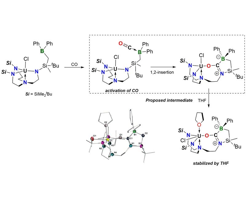 在本工作中,苏伟博士提出了利用铀中心的亲卤性和烷基的亲核性,成功制得了具有硼烷边臂的铀配合物(图1,化合物3和4)。后续的活性研究表明,化合物3利用U-B协同作用将一分子CO插入到U-N键中,验证了新颖的CO活化模式(图2);作为对比,缺少硼烷边臂的铀配合物则无法活化CO。进一步的理论计算为CO的活化提出了可能的机理,为合成具有U-B相互作用配合物提供了新的设计视角,拓展了铀配合物的功能性应用前景。