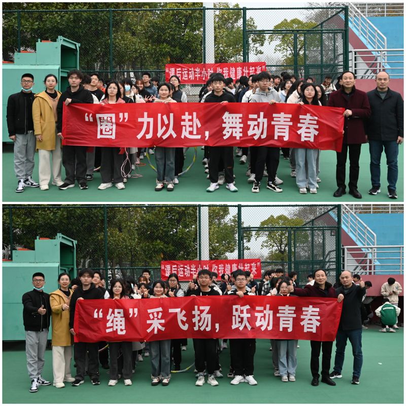 本次活动由“‘圈’力以赴 舞动青春”呼啦圈运动和“‘绳’采飞扬 跃动青春”跳绳运动两部分组成。同学们分组进行,相互配合、热情高涨。跳绳组同学们动作灵活,矫健身姿蹁若蝴蝶轻快,跃动的绳索婉如羚羊般溅越,脚尖与地面摩擦谱出动听乐章。呼啦圈组同学们灵活扭动腰肢,七彩的呼啦圈轻盈转动,如鱼儿水中畅游。五彩的跳绳、七彩的呼啦圈、一张张青春洋溢的面庞在绿茵场上绘成一幅律动的篇章。
