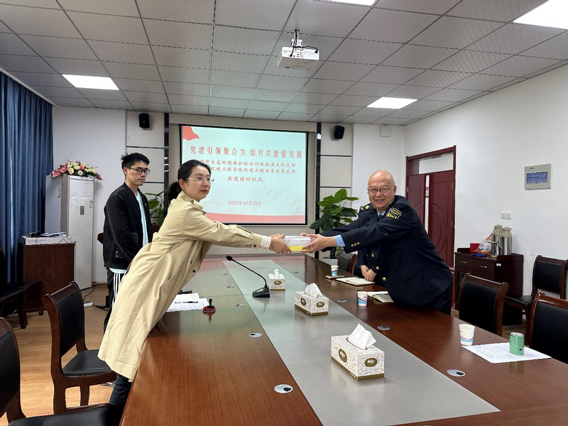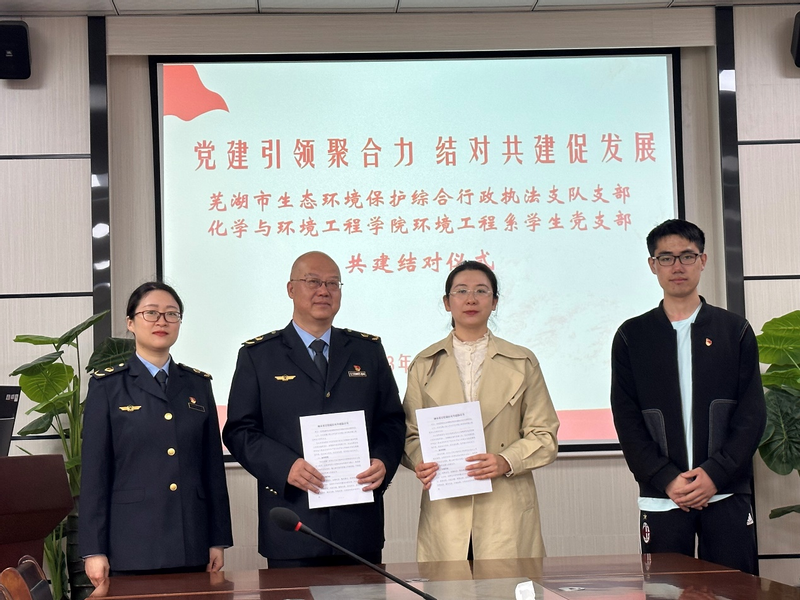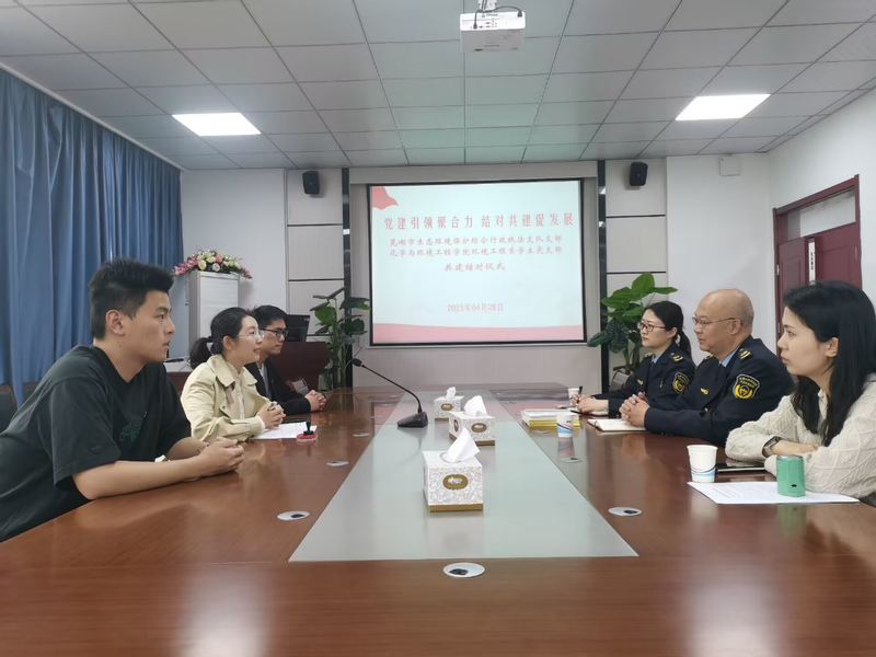 发挥党建引领作用,为支部建设增添新动力,4月28日上午,在太阳成集团tyc234cc主页会议室举行环境工程系员工党支部与芜湖市生态环境保护综合行政执法支队共建结对仪式,仪式由环工系员工支部支部书记王冰冰主持,芜湖市生态环境保护综合行政执法支队支部副书记任传军、人教科科长吕璐等人参加。