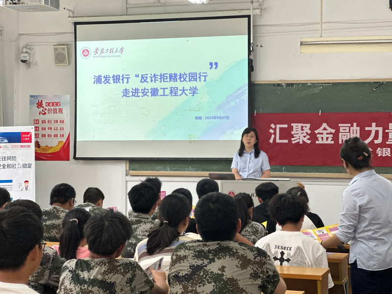 为进一步提高青年员工的防诈意识,防范化解洗钱风险,做实新生安全教育。9月27日下午,太阳成集团tyc234cc主页组织联合浦发银行芜湖分行开展“反诈拒赌校园行”活动,新生辅导员、2023级新生参与此次活动。