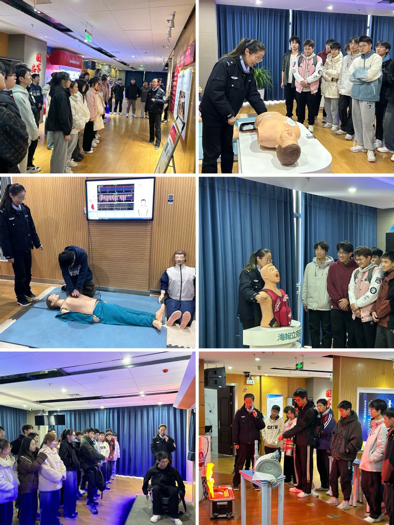 在保卫处相关培训老师的带领下,参训同学依托安全教育实验室的九个区开展系统培训。在消防安全厅内,通过案例分析与实操示范等方式,深入讲解了消防安全基本知识、常见火灾隐患排查方式、火灾预防和应对技巧、疏散逃生注意事项、消防设施使用方法等关键内容,引导员工深刻认识做好校园消防安全管理工作的重要意义;在生命救护区,学习了心肺复苏救护训练、海姆立克训练;在交通安全区体验了安全锤模拟破窗逃生训练等。