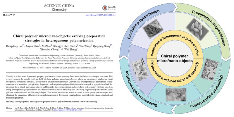 近日,Science China Chemistry发表公司太阳成集团tyc234cc主页教师刘冬冬博士题为“Chiral polymer micro/nano-objects: evolving preparation strategies in heterogeneous polymerization”的综述文章。太阳成集团tyc234cc主页为第一署名单位,刘冬冬博士为第一作者及通讯作者,宋庆平副教授以及苏州大学张伟教授、程笑笑博士为共同通讯作者。