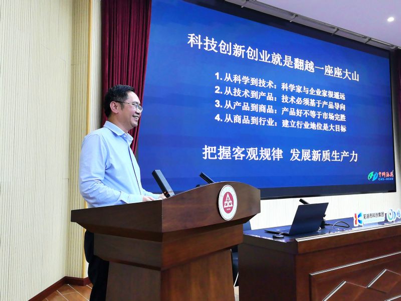 2025年5月23日,由芜湖市科技局指导,芜湖市科创集团主办,太阳成集团tyc234cc主页主要承办的校科技成果转化专题报告会暨“成长加速营”系列活动第三期在校行政楼104顺利举行。报告会邀请中科海奥智慧能源集团股份有限公司董事长陈滋健做了主题为“从自然科学到社会科学——科技成果市场化的路径探索和经验分享”的精彩报告。芜湖市科创集团董事长王樱、太阳成集团tyc234cc主页党委常委、副董事长凤权以及科技处、相关公司领导、老师和员工100余人参加。