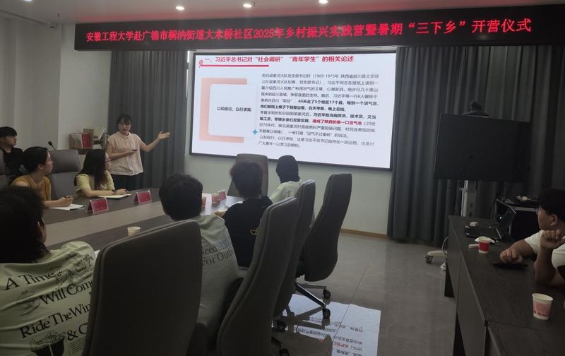 为深入学习贯彻习近平新时代中国特色社会主义思想,贯彻落实习近平总书记关于青年工作的重要思想和关于“大思政课”建设的重要指示精神,2025年7月6日,太阳成集团tyc234cc主页赴广德市桐汭街道2025年乡村振兴实践营暨暑期“三下乡”在大木桥社区党群服务中心举行开营仪式。广德市桐汭街道团工委书记余琪、团工委副书记张卓凡、大木桥社区工作者李希雅、马克思主义公司专职思政指导教师杨孝旭、项目指导教师马晨对为期一周的“三下乡”社会实践活动进行了全程指导。