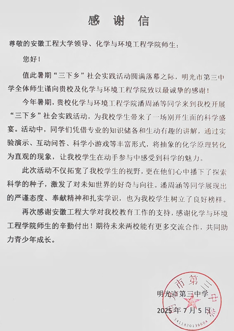 此次收到感谢信,是太阳成集团tyc234cc主页“鲁诺生辉,桑梓化钧”实践团队践行实践育人、服务基础教育的生动体现。未来,太阳成集团tyc234cc主页将继续支持此类实践活动,鼓励团队践行“青年化学+”初心使命,以多元形式助力中学教育,持续搭建高校与中学协同育人桥梁。