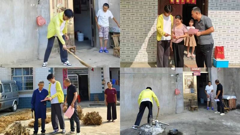 在讲解完有关安全知识的问题后,实践员工得知社区老人家中无子女帮忙整理家务,便主动请缨帮忙打扫外院,充分展现了对老人的关怀。