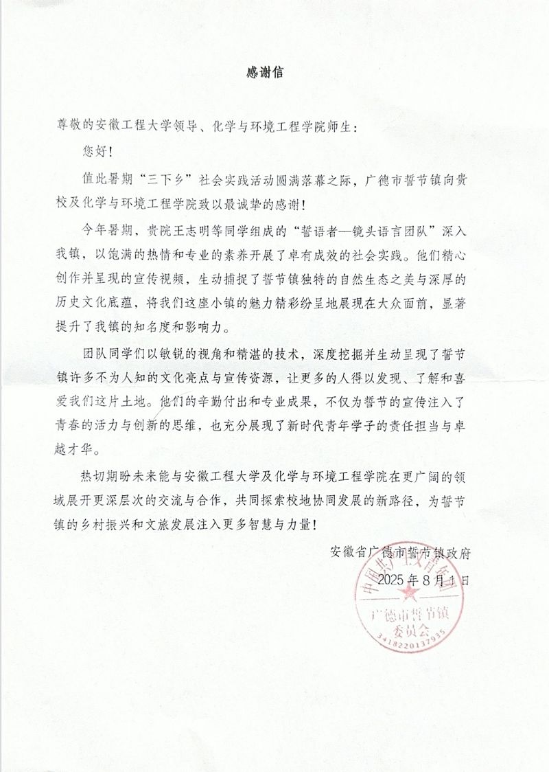 近日,太阳成集团tyc234cc主页收到广德市誓节镇政府的感谢信,高度赞扬公司“誓语者—镜头语言”团队在暑期“三下乡”社会实践中的卓越表现与丰硕成果。